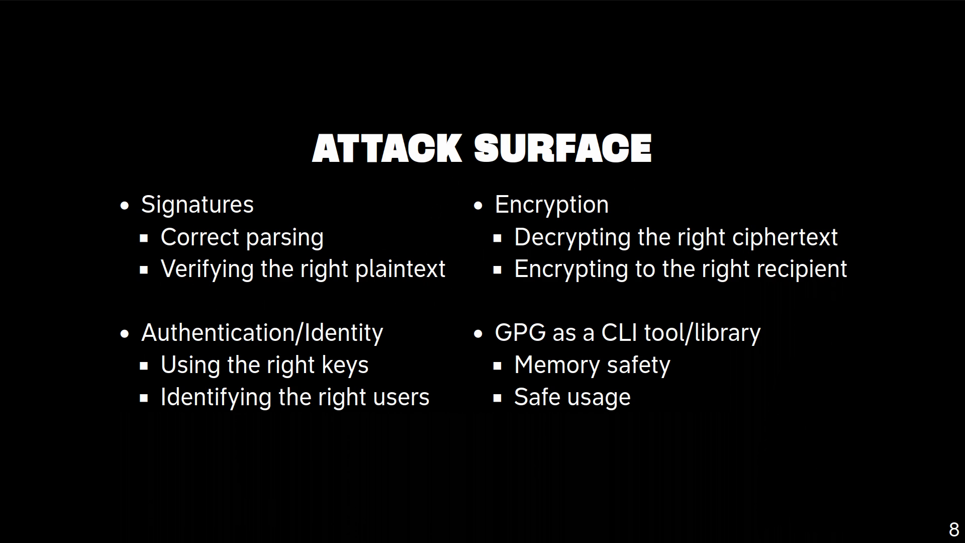 GPG has several use cases for dependencies and verifying downloads among others. It's attack surface around having correct parsing, authentication, encryption and PGP as a CLI / Tool library. #39c3