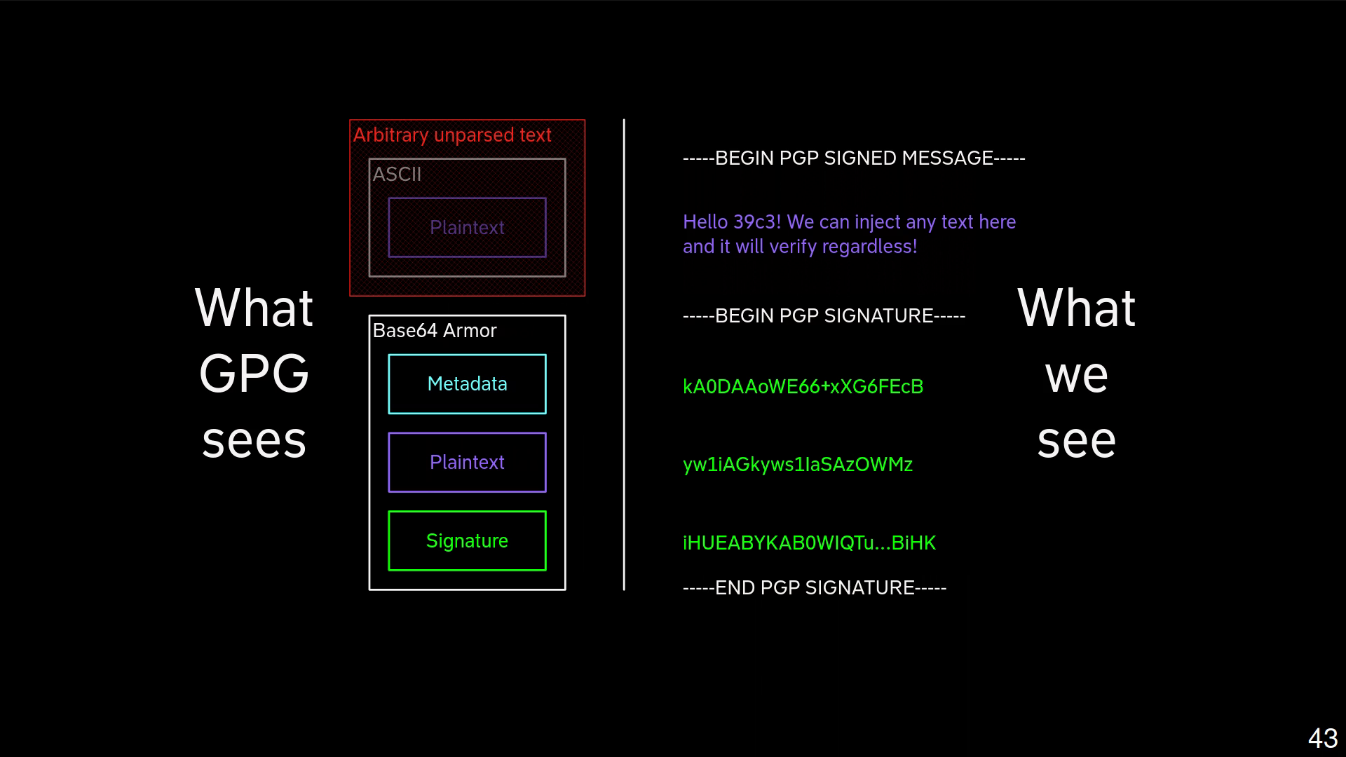 Walkthrough of a vulnerability where for any signed message, an attacker can create a cleartext signature with any content that verifies correctly for the original signer. This has been reported but no patch is currently available. #39c3