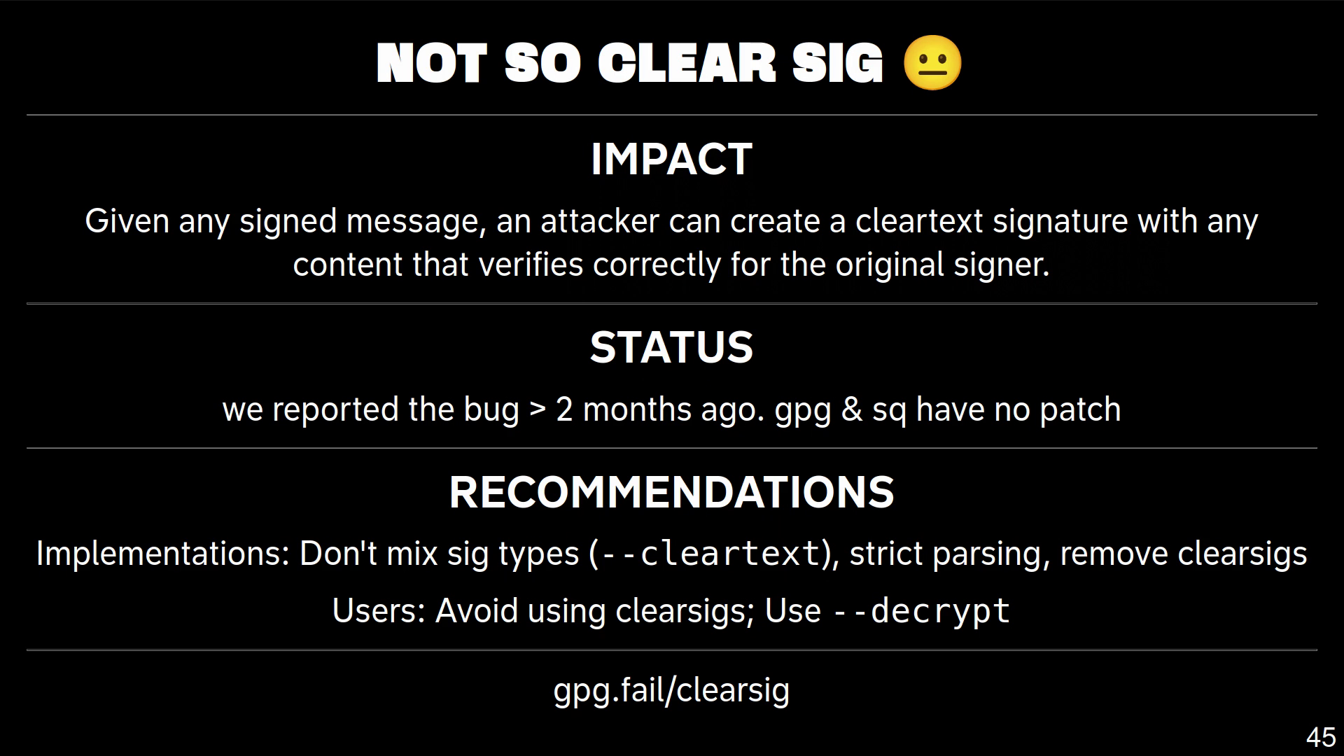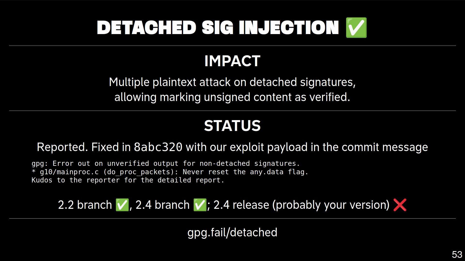 Great research! 14 GPG vulnerabilities found in one year and only some of them have been fixed. GnuGP doesn't sign their own commits 🤦♂️#39c3
