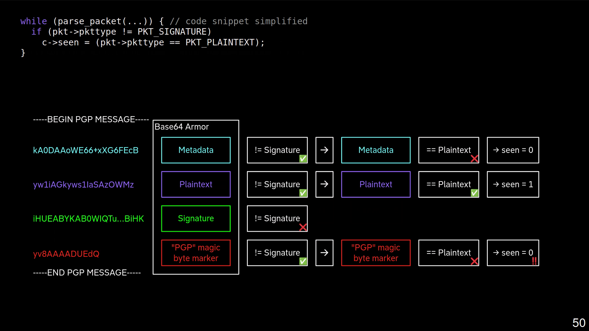 Walkthrough of a plaintext attack on detached signatures which allows the marking of unsigned content as verified. This has been reported and has been patched but is not in the latest version. #39c3