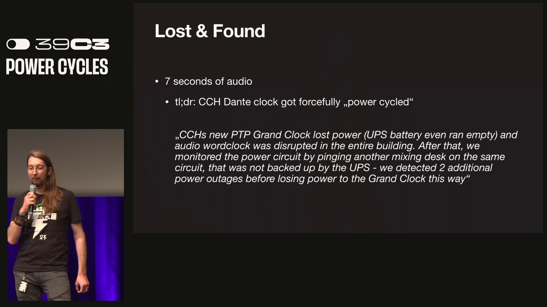 7 seconds of audio was lost due to the Dante master clock being forcefully power cycled. Also some cables experienced some pain. #39c3
