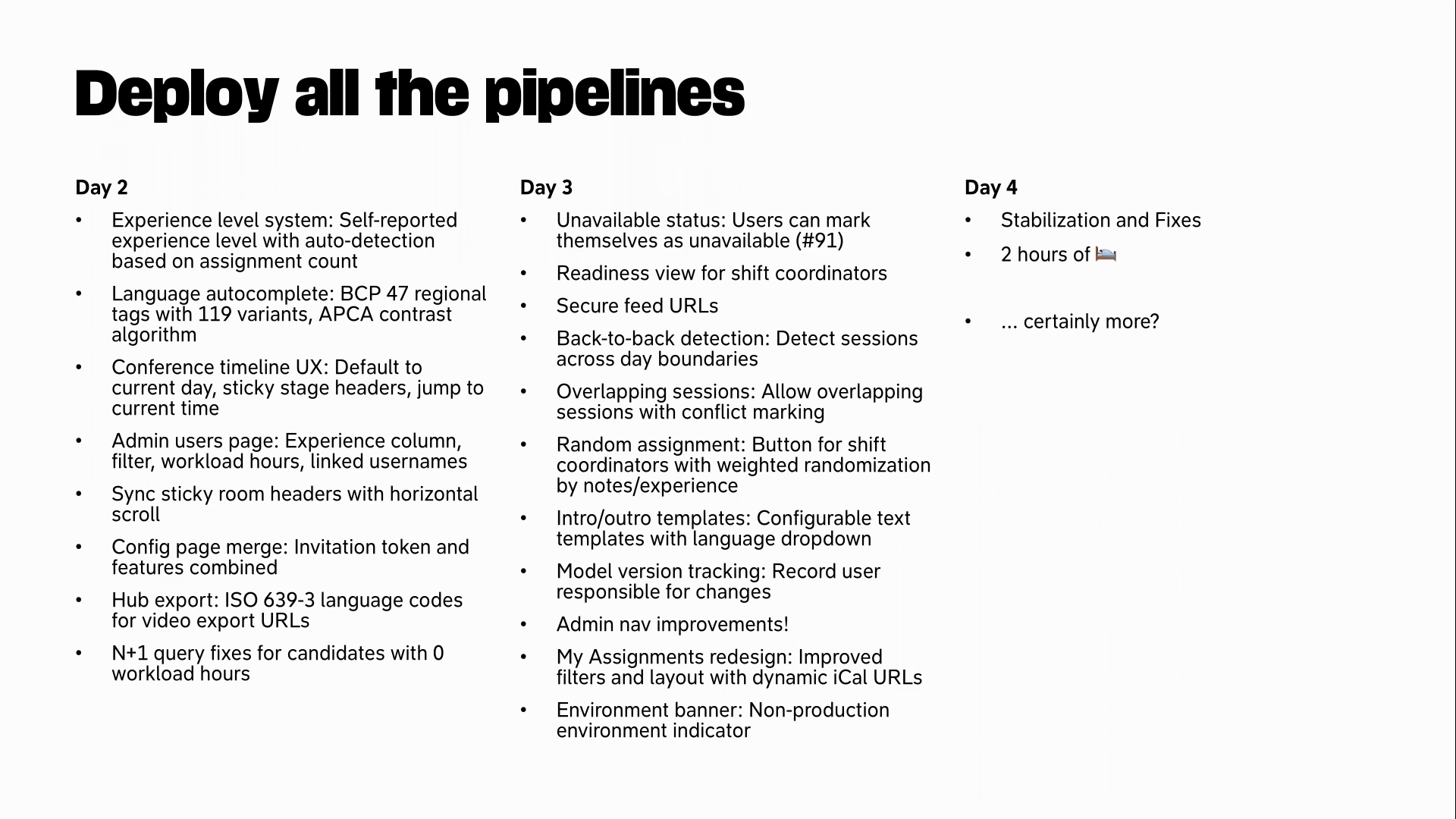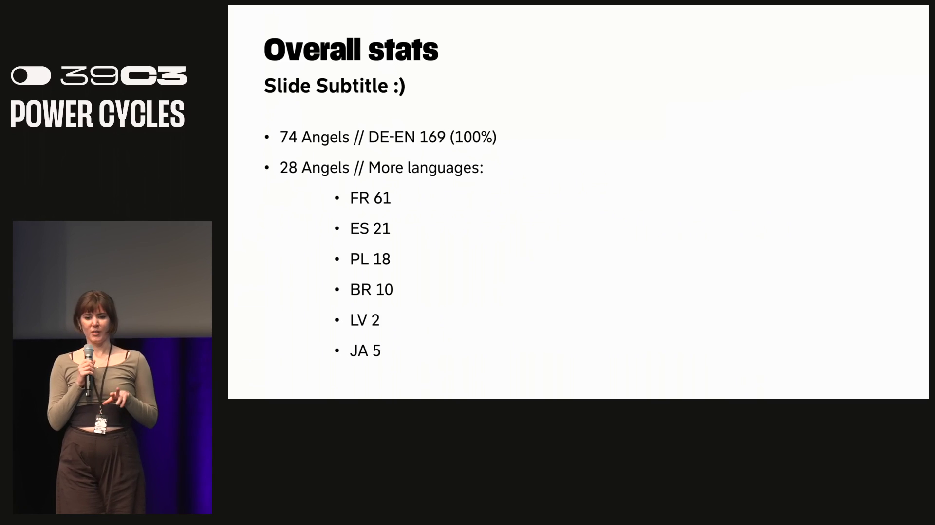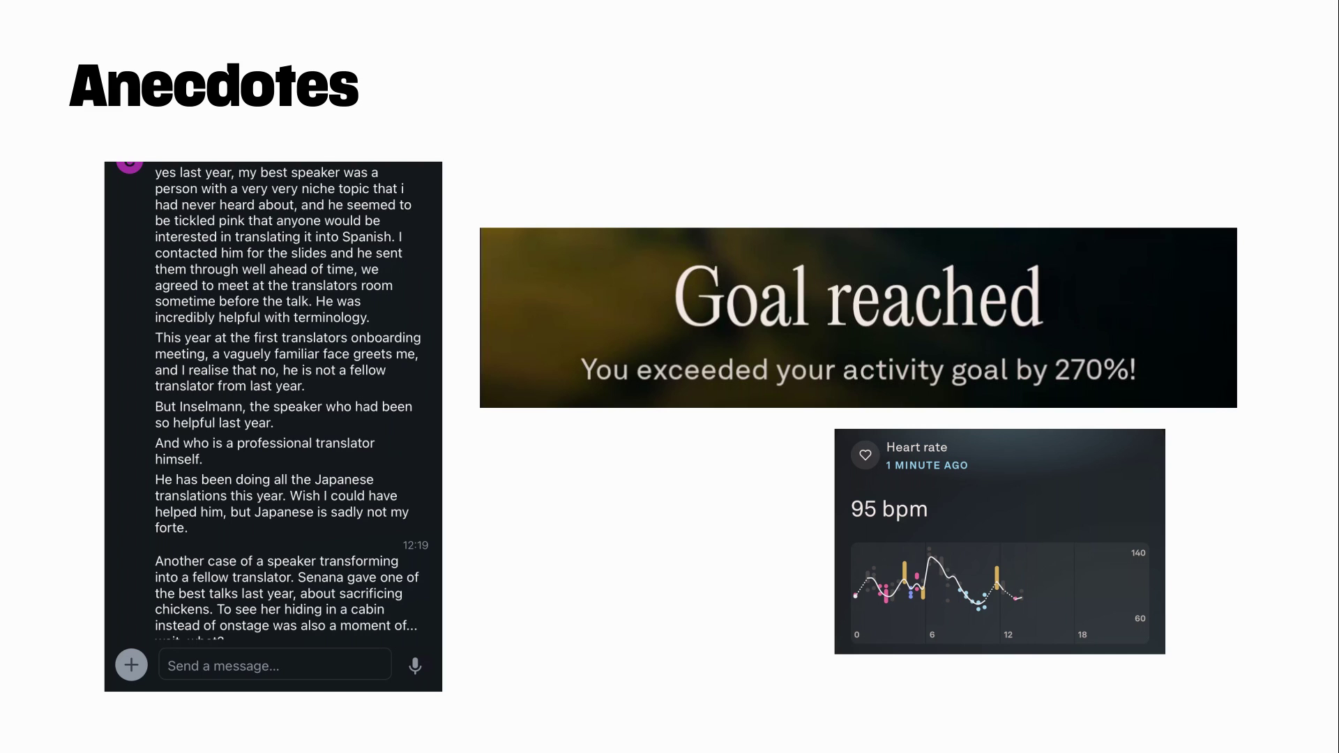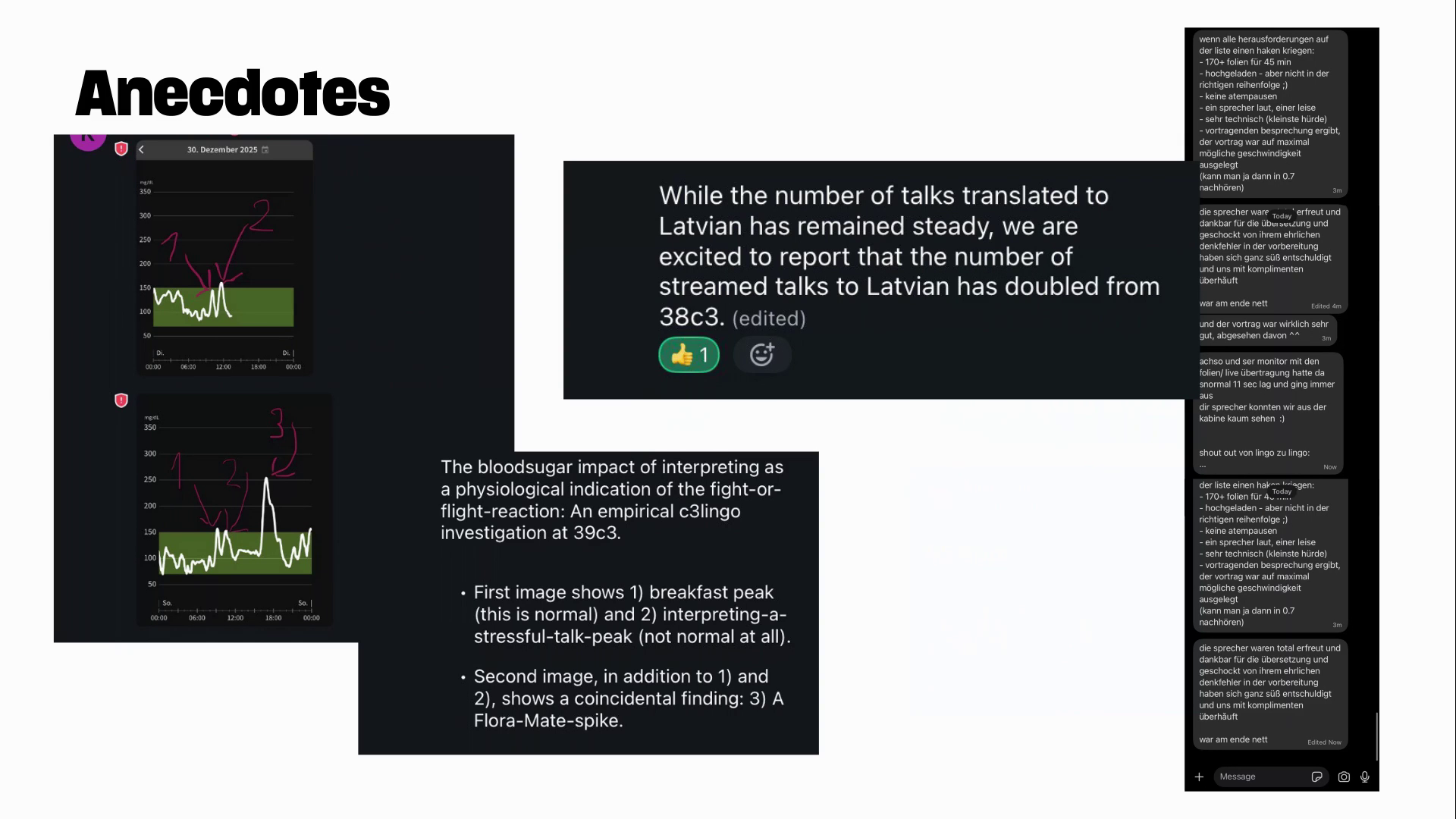 One speaker had 170 slides for a 45 minute talk and had practiced to get a high word per minute rate which made this very difficult to translate. Doing this takes a significant toll on the translation team. #39c3