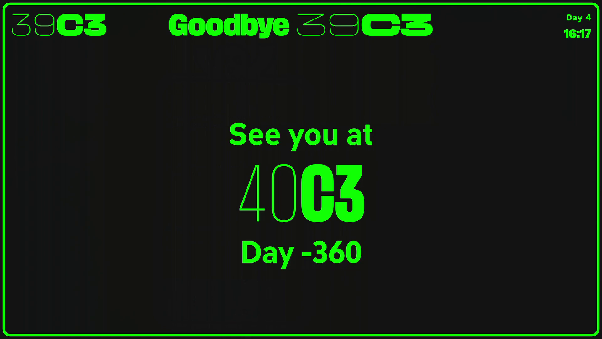 Massive thank you to everyone who made #39c3 possible! This event is built by the community, for the community and it shows.