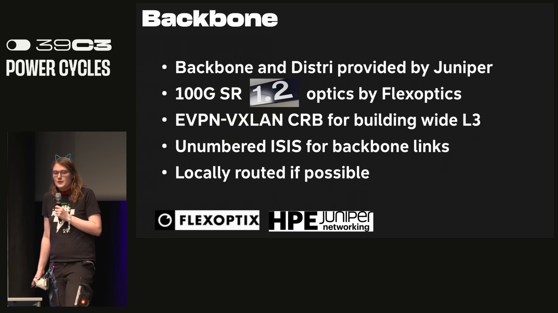 All of these links are 100Gbps. Backbone and distribution was done by Juniper. The optics were provided by Flex Optics. EVPN-VXLAN CRB for building wide L3. #39c3