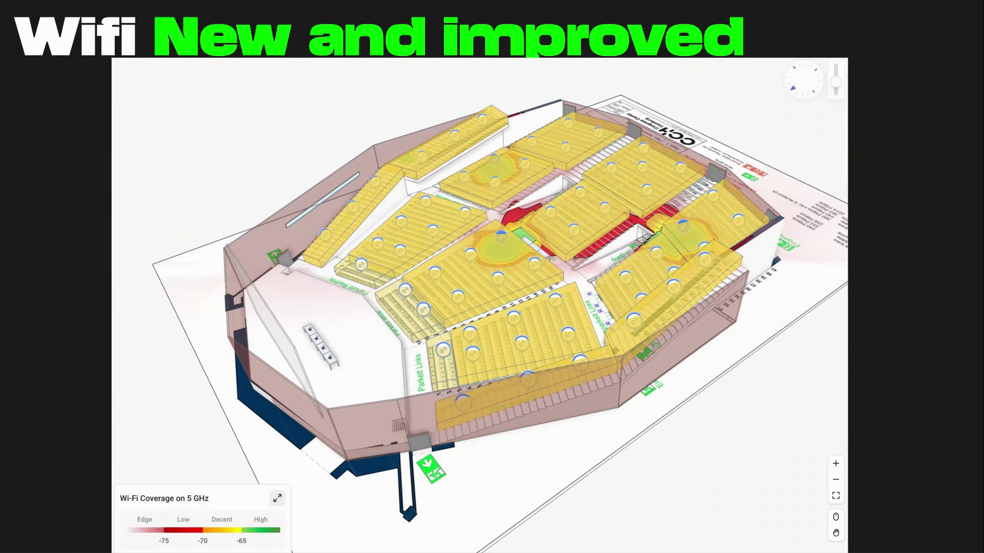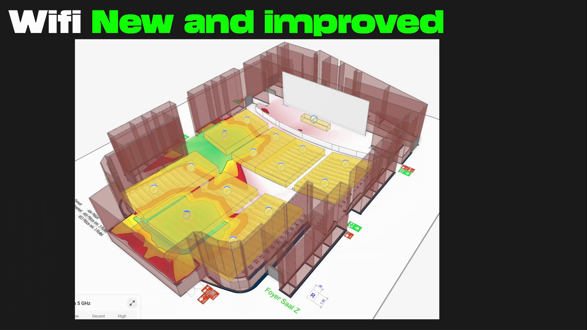 The team managed to deploy WiFi 6 across the bulding with a peak of 10277 clients. Planning was done in Hamina which made the wifi deployment better. Almost a third of capacity was over 6Ghz. #39c3