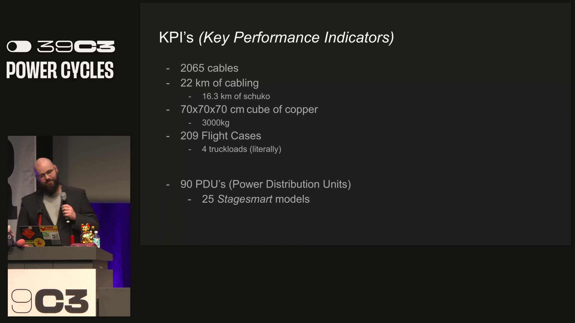 The power team laid 20655 cables which span 22km of cables which weighed will be 3 tons of copper. They brought 209 flight cases and deployed 90 PDUs of which 25 were stagesmart models. They also tested RCDs for trip times.