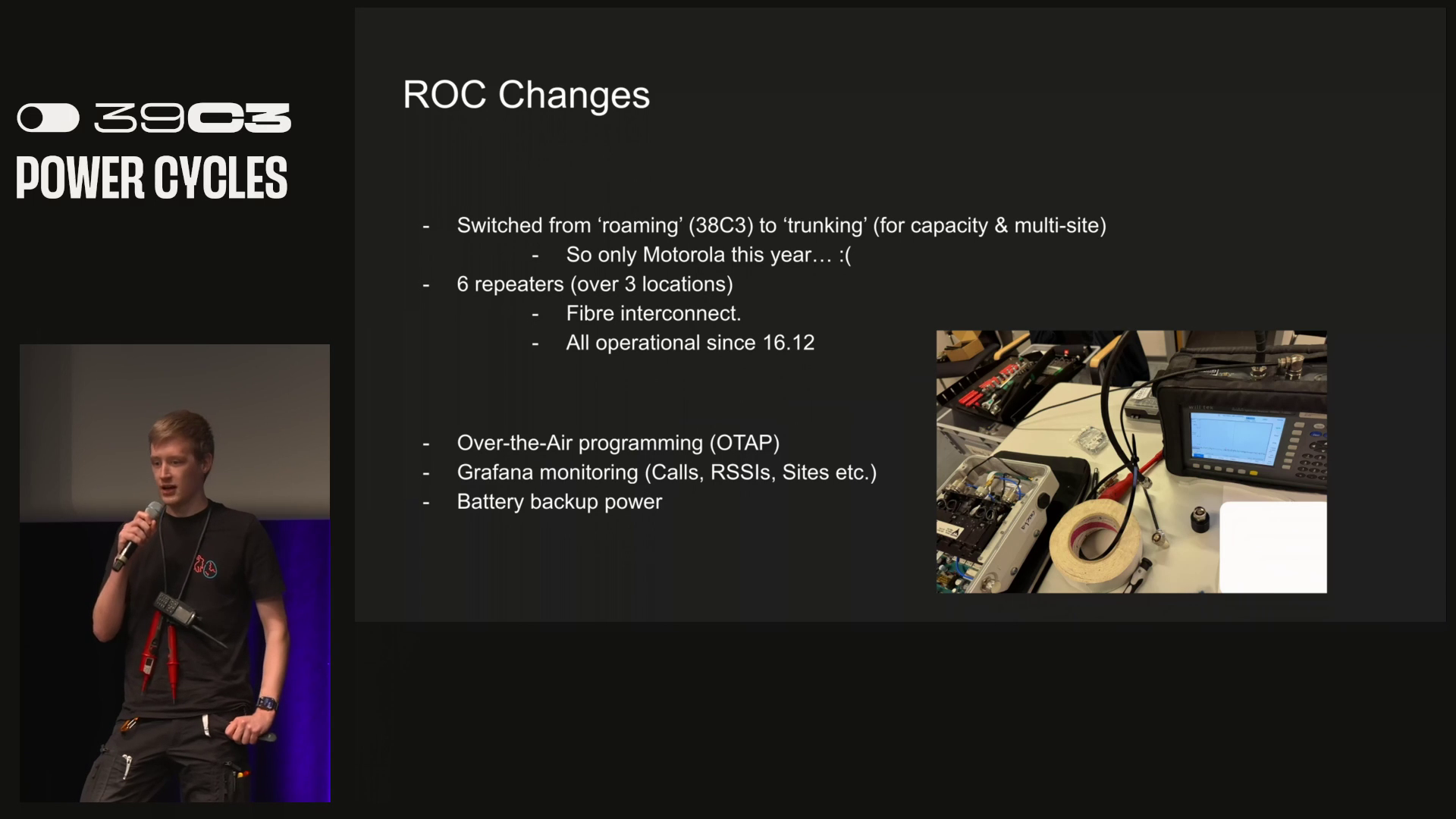 The team handed out a bunch of keys and deployed radios in a trunking topology (instead of roaming). 6 repeaters were deployed. #39c3
