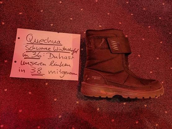 Bitte helft mir bei der Verbreitung: An die Besitzer des 2. rechten schwarzen Quechua-Kinderstiefels in 36, der noch vor dem #Kidspace steht: Ihr habt unseren linken davon in Größe 38 mitgenommen. Wir bitten um Rückgabe, da unser Kind nun kein Paar mehr hat!