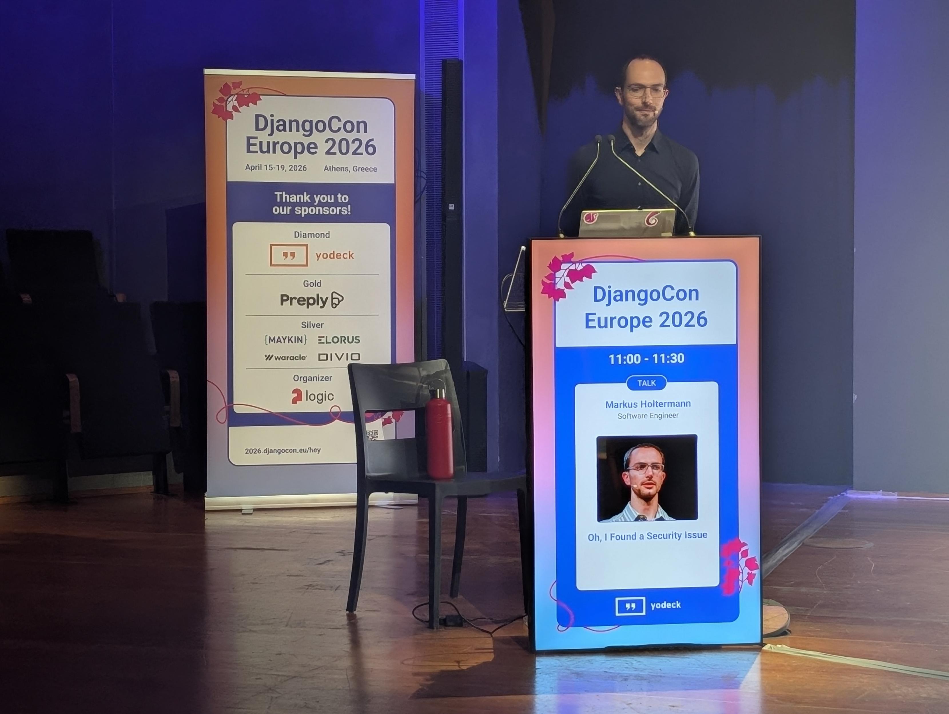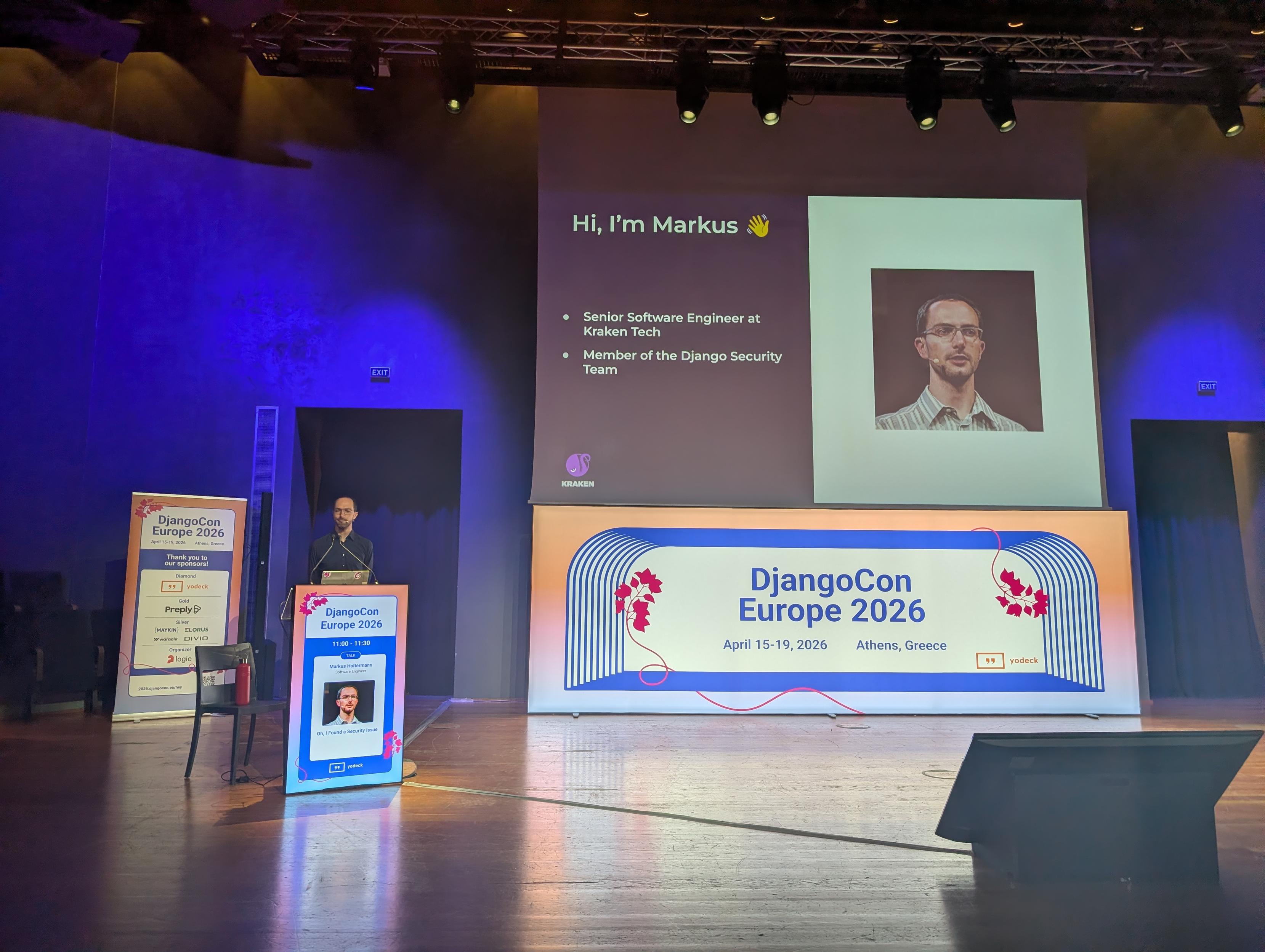 Great to see @markush on stage talking about Django’s security process, from triaging and fixes to disclosure and releases, with a look at how AI might impact all of this… really curious about this one 👀