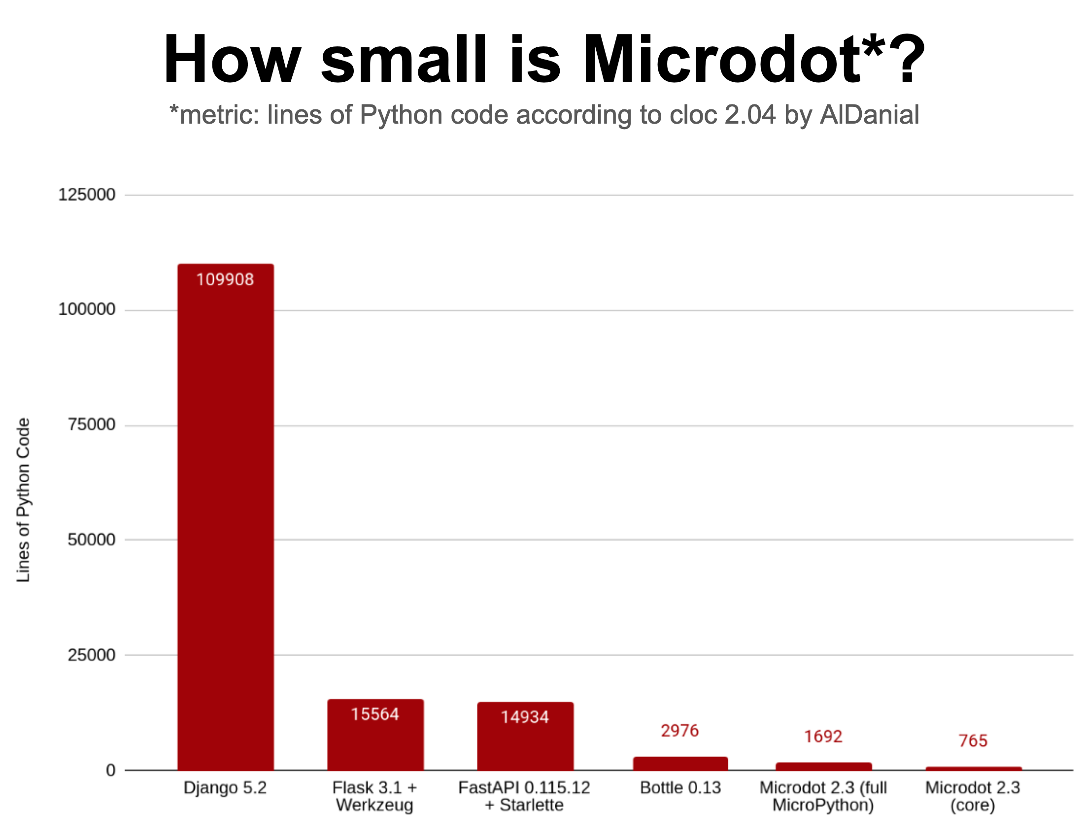 This is the slide of my #EuroPython presentation about my Microdot web framework for Python and MicroPython in which I compare its size against well known frameworks.
