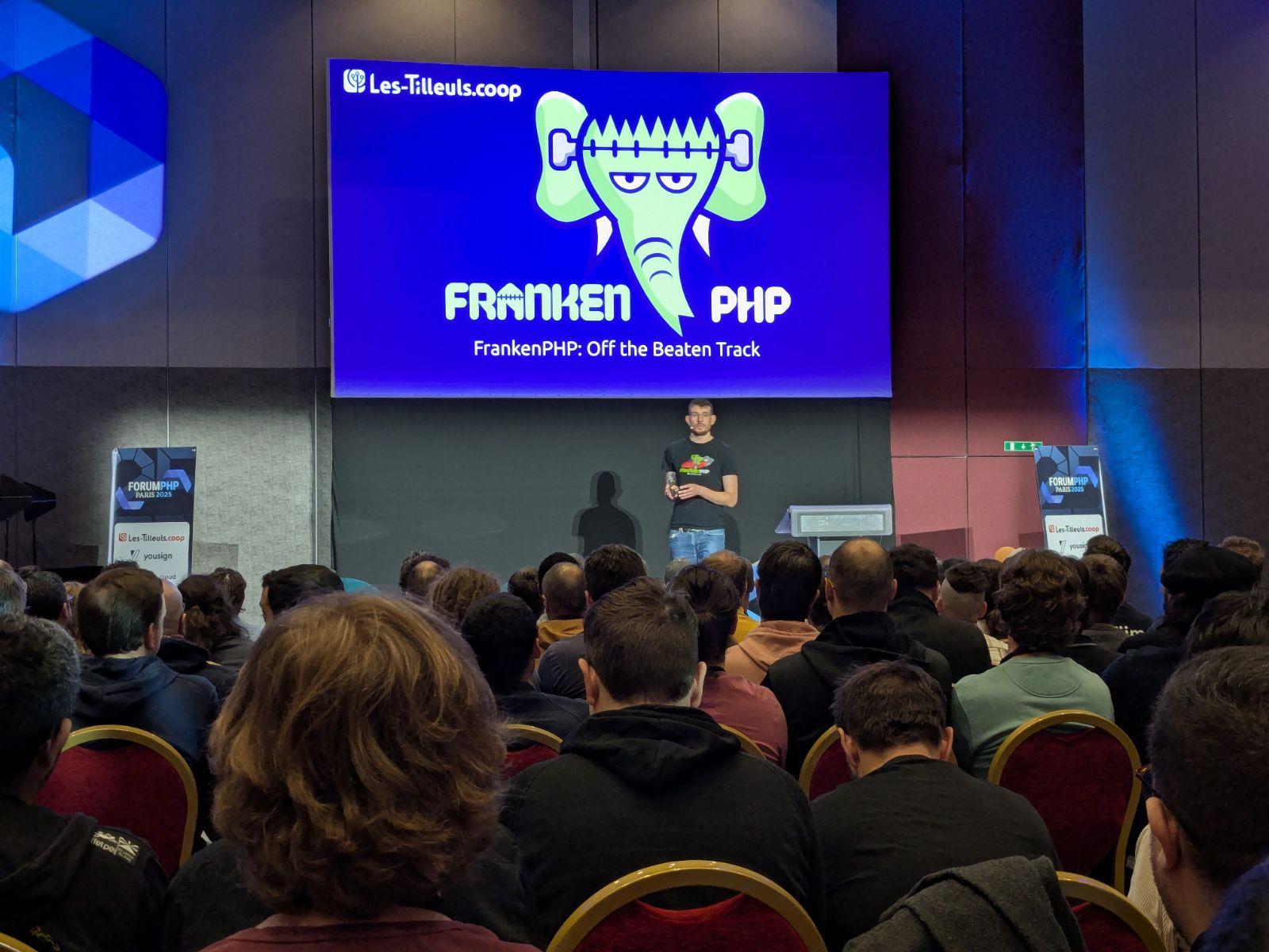 🎤 3ème talk de la journée pour la team de Les-Tilleuls.coop au #ForumPHP, avec @dunglas qui nous fait découvrir les fonctionnalités avancées et encore méconnues de #FrankenPHP, et notamment comment intégrer Go à vos applications PHP pour leur donner des superpouvoirs. 🦸