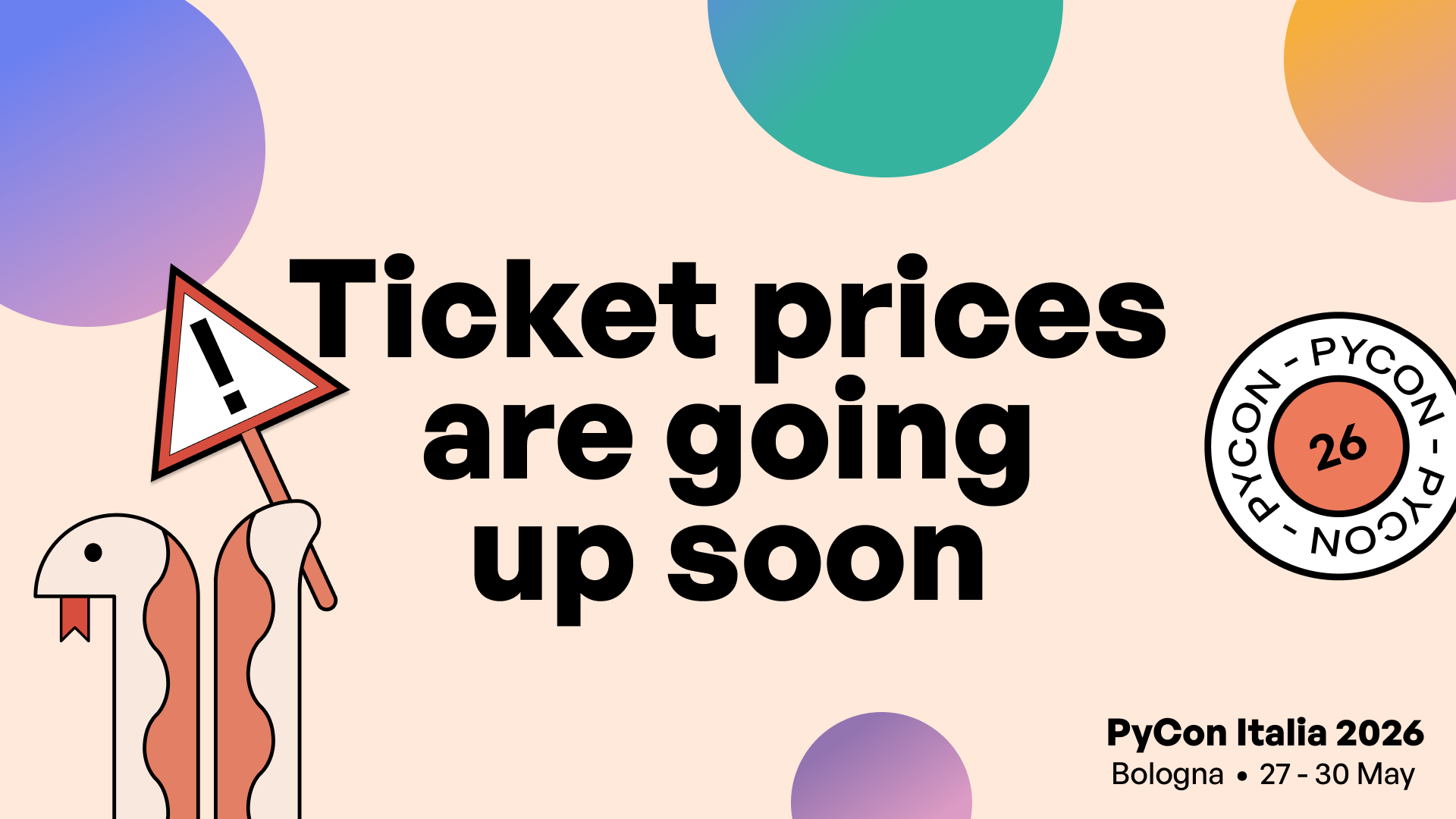Personal will go from 200€ to 300€ and business from 300€ to 400€! Save 100€ by buying the Regular tariff before March 27 AoE: pycon.it/tickets